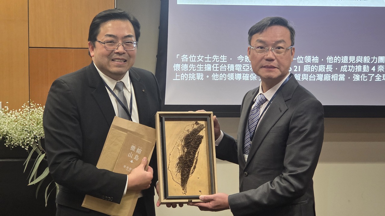 NATEA总会长杨燿宏(左)于年会中颁发卓越奖予台积电亚利桑纳厂资深副总经理杨怀德,肯定其在美国建立世界级晶圆厂的贡献。(记者张庭瑜/摄影)
