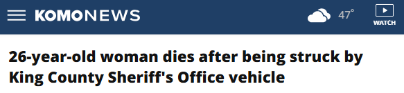 据报道,门罗警方于早上6点30分左右抵达事故现场。一名26岁女性在18800 街区附近的US-2公路西行车道上,被一辆无标识的金县警察局车辆撞倒。该女子被送往当地医院后不治身亡。