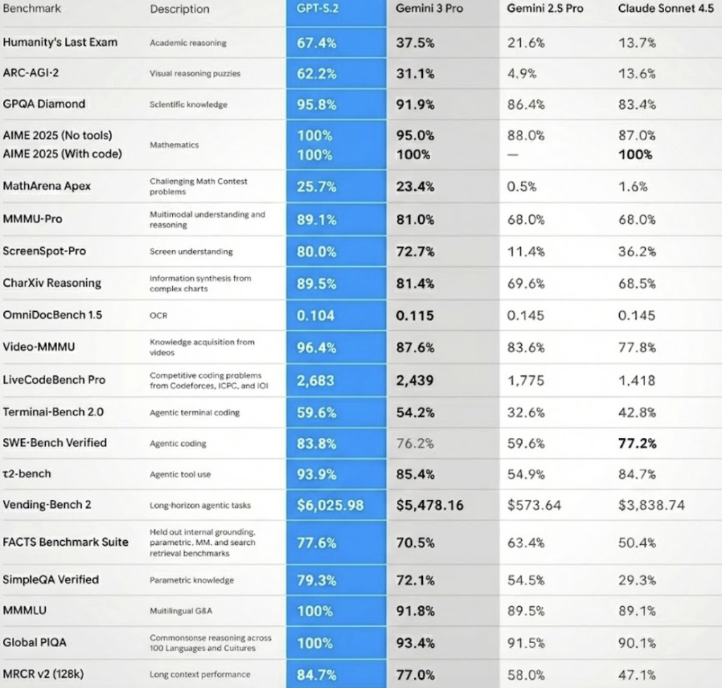 社交媒体流传的对比图显示,GPT-5.2在参数上几乎全面“碾压”Gemini 3和Claude 4.5。Sam Altman也在内部评估中宣称,新模型在推理能力上将领先于谷歌竞品。