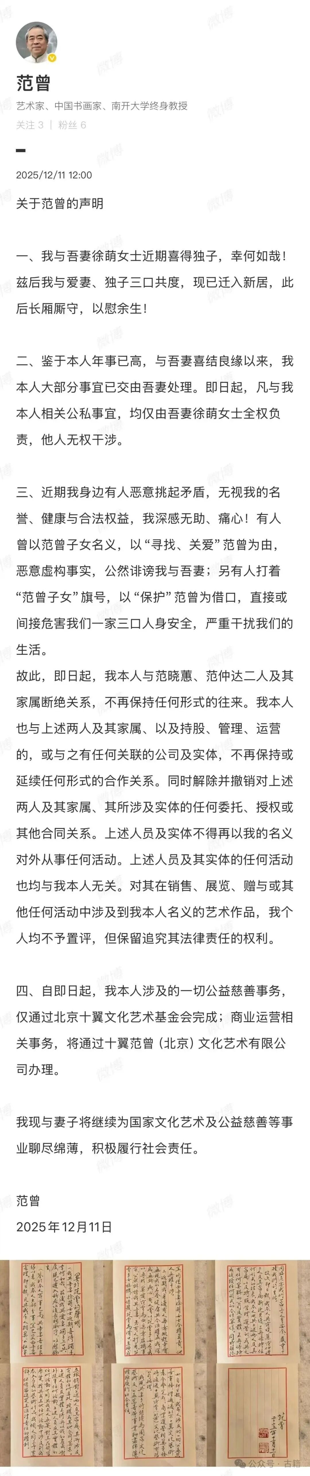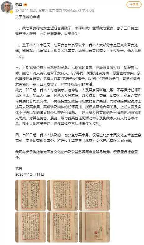 12月11日,87岁的范曾公开发文,这也是“失联”风波后,范曾首次公开发声。他告知外界,已经87岁的他再次当爸,妻子徐萌已顺利生产,是个男孩。