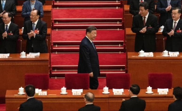 图为中共党魁习近平(中)于 2025 年 3 月 8 日抵达中国北京人民大会堂出席全国人民代表大会第二次全体会议。(图片来源:Kevin Frayer/Getty Images)