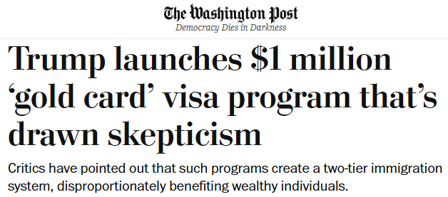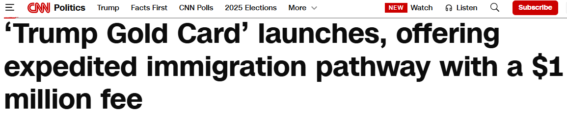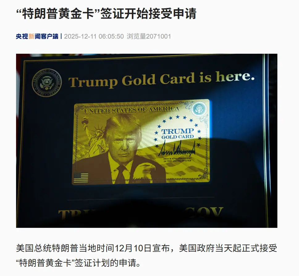 总统川普周三正式推出名为“黄金卡”(gold card)的新签证项目,这是一条新的移民途径,允许外国人支付100万美元以加快其签证申请流程,或由企业支付200万美元来为其希望带入美国的外国员工提供担保。 “对我和国家来说,非常令人振奋的是,我们刚刚推出了‘川普黄金卡’。”川普在白宫的一场圆桌会议上说。