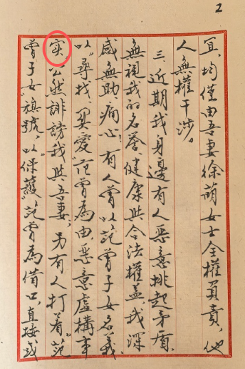 第一次出现在第3页:“即日起,我本人与范晓蕙、范仲达二人及其家属断绝关系”,这里写作“关係”。