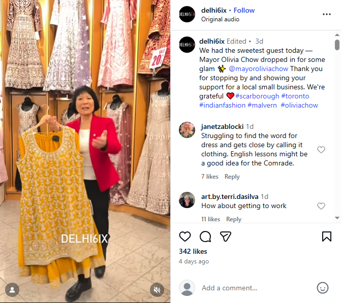 多伦多市长邹至蕙(Olivia Chow)最近没跳舞、没骑自行车、没修路……而是跑到士嘉堡一家小店当起了“带货主播”,高举印度礼服喊“买它!”