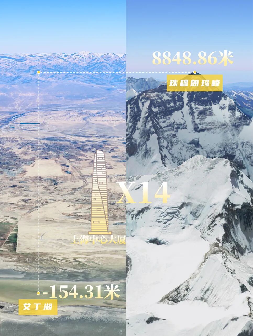 这一高一低,海拔落差足足有9003米,相当于14座上海中心大厦叠起来。▼