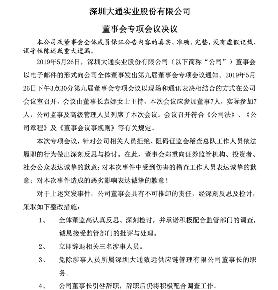 上市公司深大通2019年5月26日发布公告称,针对公司相关人员拒绝、阻碍证监会稽查总队工作人员依法履职的行为做出深刻反思与检讨。深大通表示,“公司董事长引咎辞职,辞职后仍将积极配合调查工作;立即辞退相关三名涉事人员;免除涉事人员所属深圳大通致远供应链管理有限公司董事长的职务。”