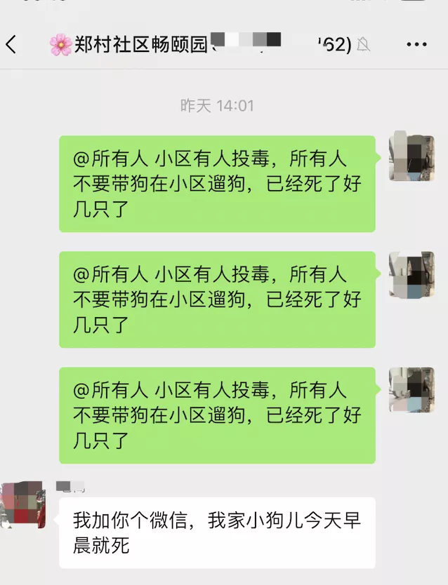 医生透露,上午已经送来十几只,医院救不过来了。她将医生的嘱托转发到小区住户群里,“赶紧通知小区物业,不要再遛狗了,或者是戴上嘴套”。连发三遍提醒后,立刻有个叔叔回应了Penny。这是Penny联系到的第一个中毒犬的主人。