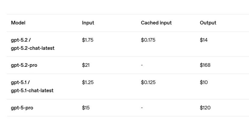 从定价策略来看,GPT-5.2在API层面的价格定在每百万输入token 1.75美元,每百万输出token 14美元,比前代GPT-5.1分别贵了40%。