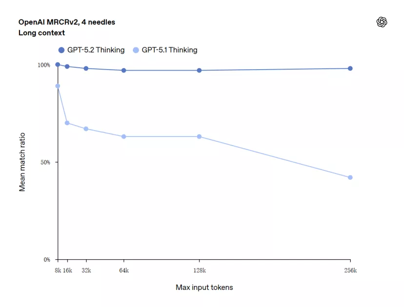 GPT-5.2在长文档理解上也有明显进步。在OpenAI的MRCRv2测试中,它成为首个在256k token长度下,针对4-needle变体任务达到近乎100%准确率的模型。