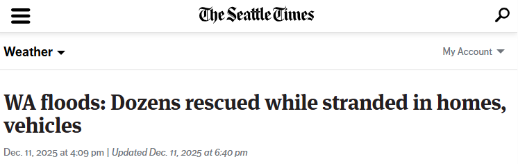据12月11日报道,周四(11日),历史性洪水和暴雨席卷华盛顿州西部,救援人员已成功营救出数十名民众。