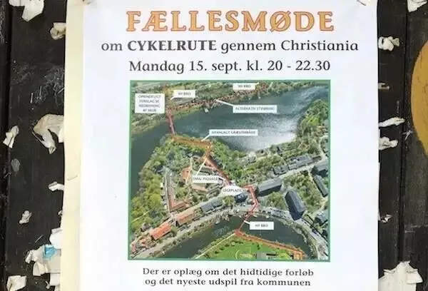 克里斯钦共同会议的通告,议题是哥本哈根市政府修的自行车专用快速道要穿过克里斯钦。