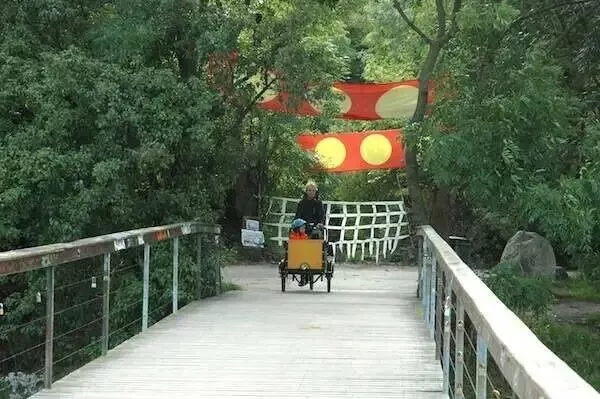 也许克里斯钦人比较喜欢创新和多元的文化,他们在比较热闹的旧工厂区建了一座微形的西藏佛塔(Stupa),而在内城墙的水边,则建了一个飘浮的蒙古包——在我看来,这是一个强烈的象征——陆地上的游牧居所再飘浮在水上,凸显了双重的移动性。