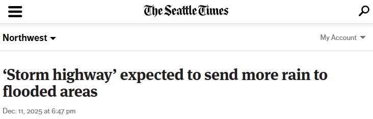 美国国家气象局西雅图办公室的气象学家Harrison Rademacher表示:“风险在于土壤含水量已接近饱和,这将使原本暴涨的河流承受更多降雨。”
