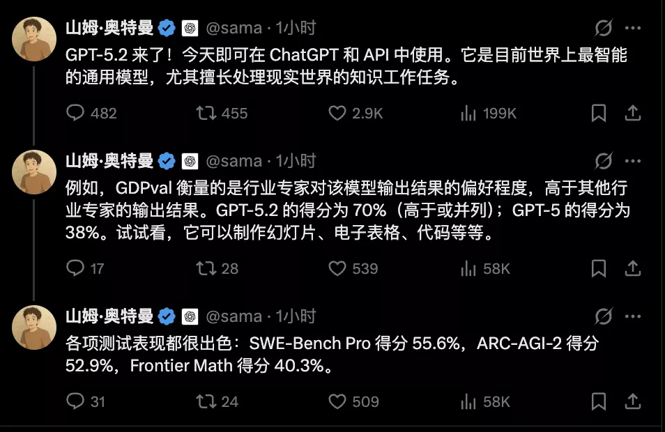 就在一周多前,奥特曼在给员工的私人信息中宣布进入“红色警戒”状态,调集更多资源投入 ChatGPT。行业对于GPT-5.2的预期为,硬刚Gemini 3,夺回SOTA。但是,这次GPT-5.2的发布,并没有看出“应战”的火药味和心虚的“不服感”。