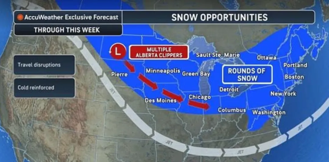 本周,大雪和凛冽寒风将横扫美国中西部和东北部地区。