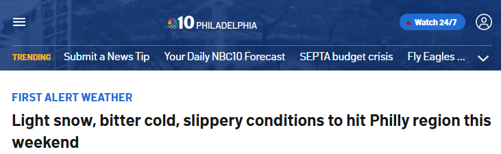 降雪后将伴随低温与路面湿滑状况 周日下午降雪将逐渐停止,但紧随其后的冷空气将涌入费城地区,气温自午后起至周日夜间将持续下降。
