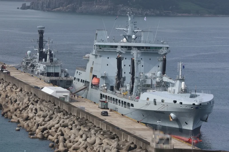 8月13日,韩国釜山,英国护卫舰“里士满”号与“泰德斯普林斯”号舰队油水补给舰停靠釜山海军基地。 IC Photo