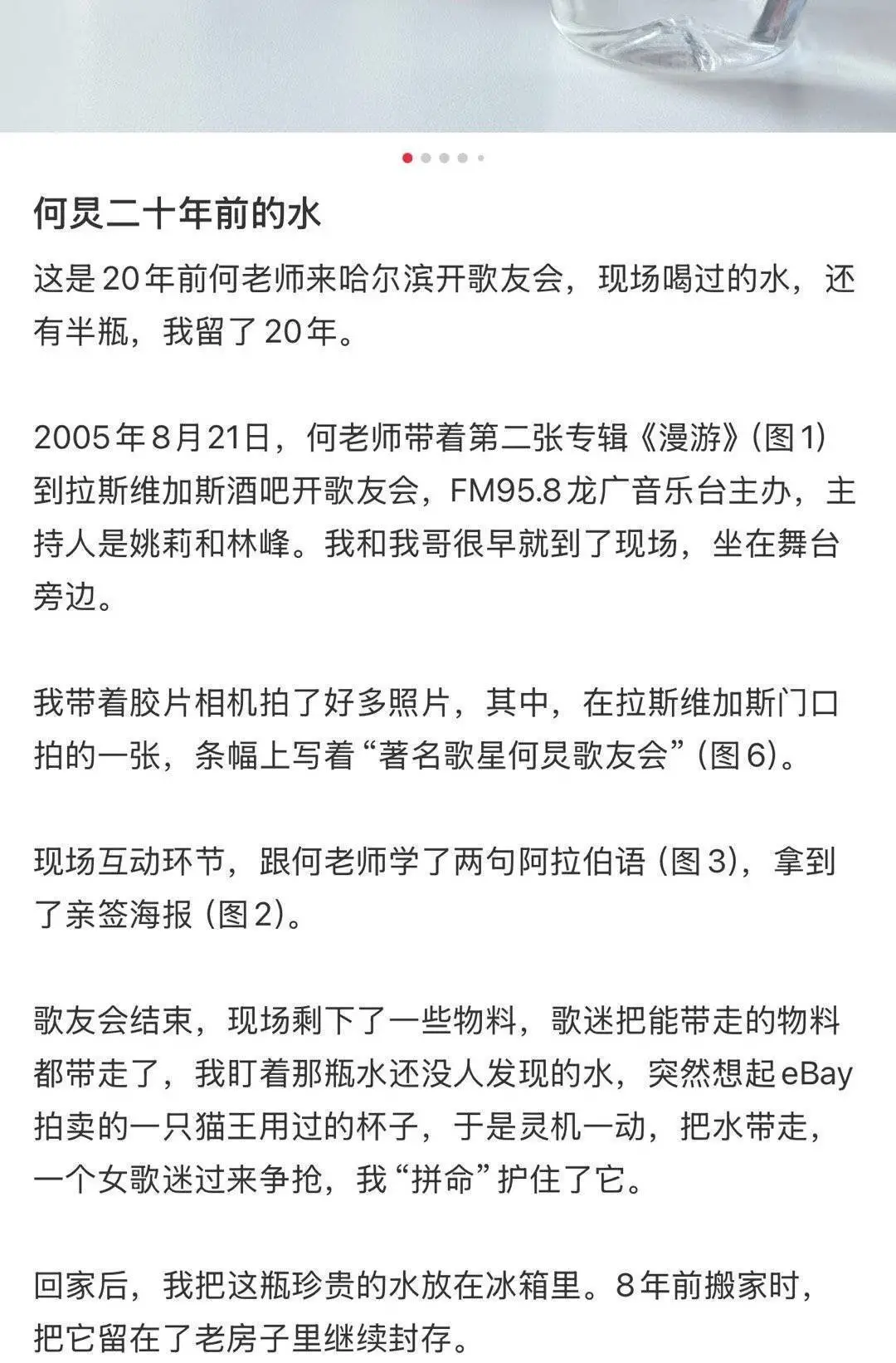 该网友写道:“这是20年前何老师来哈尔滨开歌友会,现场喝过的水,还有半瓶,我留了20年。歌友会结束,现场剩下了一些物料,歌迷把能带走的物料都带走了,我盯着那瓶还没人发现的水,突然想起eBay拍卖的一只猫王用过的杯子,于是灵机一动,把水带走,一个女歌迷过来争抢,我‘拼命’护住了它。回家后,我把这瓶水珍贵的水放在冰箱里。8年前搬家时,我把它留在了老房子里继续封存。”