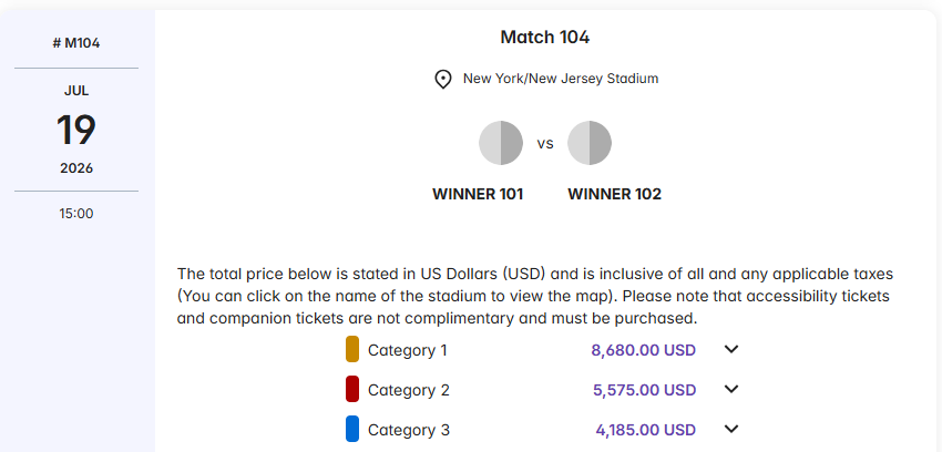 根据FIFA官网上的定价表,世界杯决赛的“经济票”起价为4185美元,“标准票”为5575美元,“高端票”则为8680美元。