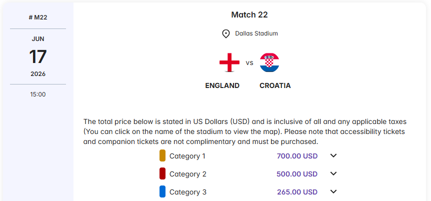 根据FIFA官网公布的票价,英格兰队首战在美国达拉斯对阵克罗地亚,最便宜的门票也要265美元。