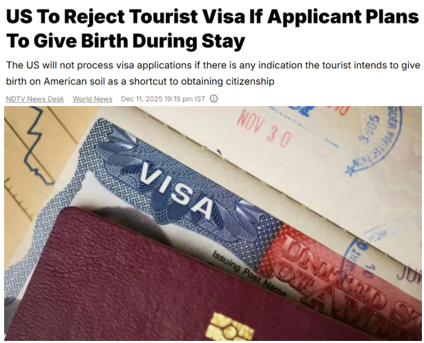 12月11日,美国大使馆在X社交媒体平台上再次发布声明称,任何迹象表明游客打算在美国生育以获得公民身份的捷径,都将导致签证申请被拒绝。