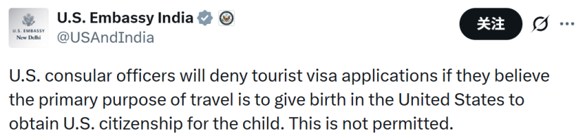 “如果美国领事官员认为旅行的主要目的是在美国分娩以获得美国公民身份,那么他们将拒绝该旅游签证申请。这种行为是不被允许的,”美国驻印度大使馆在帖子中写道。