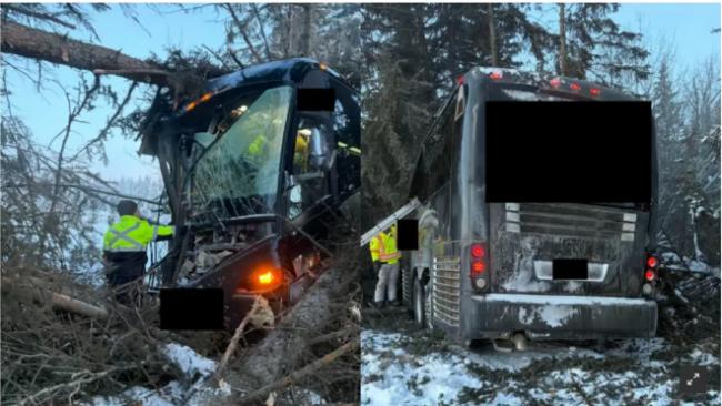 Athabasca RCMP表示,这辆运载当地Junior A冰球队的教练巴士当时正向南行驶,随后失控驶入公路西侧的沟渠,直接撞穿多棵树木。