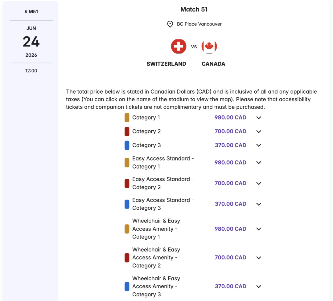 2026 年 6 月 18 日加拿大对卡塔尔,以及 6 月 24 日加拿大对瑞士,这两场比赛票价相同。