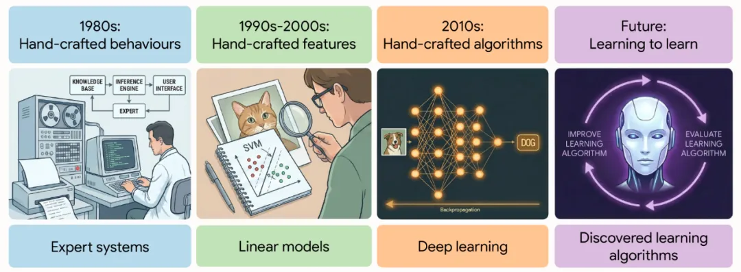 强化学习的核心是让智能体通过与环境的交互,不断调整行为策略以最大化累积奖励。几十年来,研究者们手动设计了一系列经典算法:从基于时序差分的TD学习,到兼顾探索与利用的Q学习,再到如今广泛应用的近端策略优化(PPO)和分布式强化学习(Distributional RL)。这些算法在围棋、星际争霸等复杂任务中取得了瞩目成就,但人工设计的局限性也日益凸显。