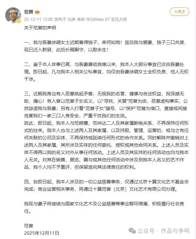 12月11日深夜,87岁国画大师范曾在社交平台甩出一份重磅《声明》,瞬间炸翻全网。具体内容见下图: 老范喜得子,群众爱吃瓜,网上诸诗友作诗作联有贺: 得弄新璋,老当益壮独为范; 复夸佳偶,喜获重生别样萌。