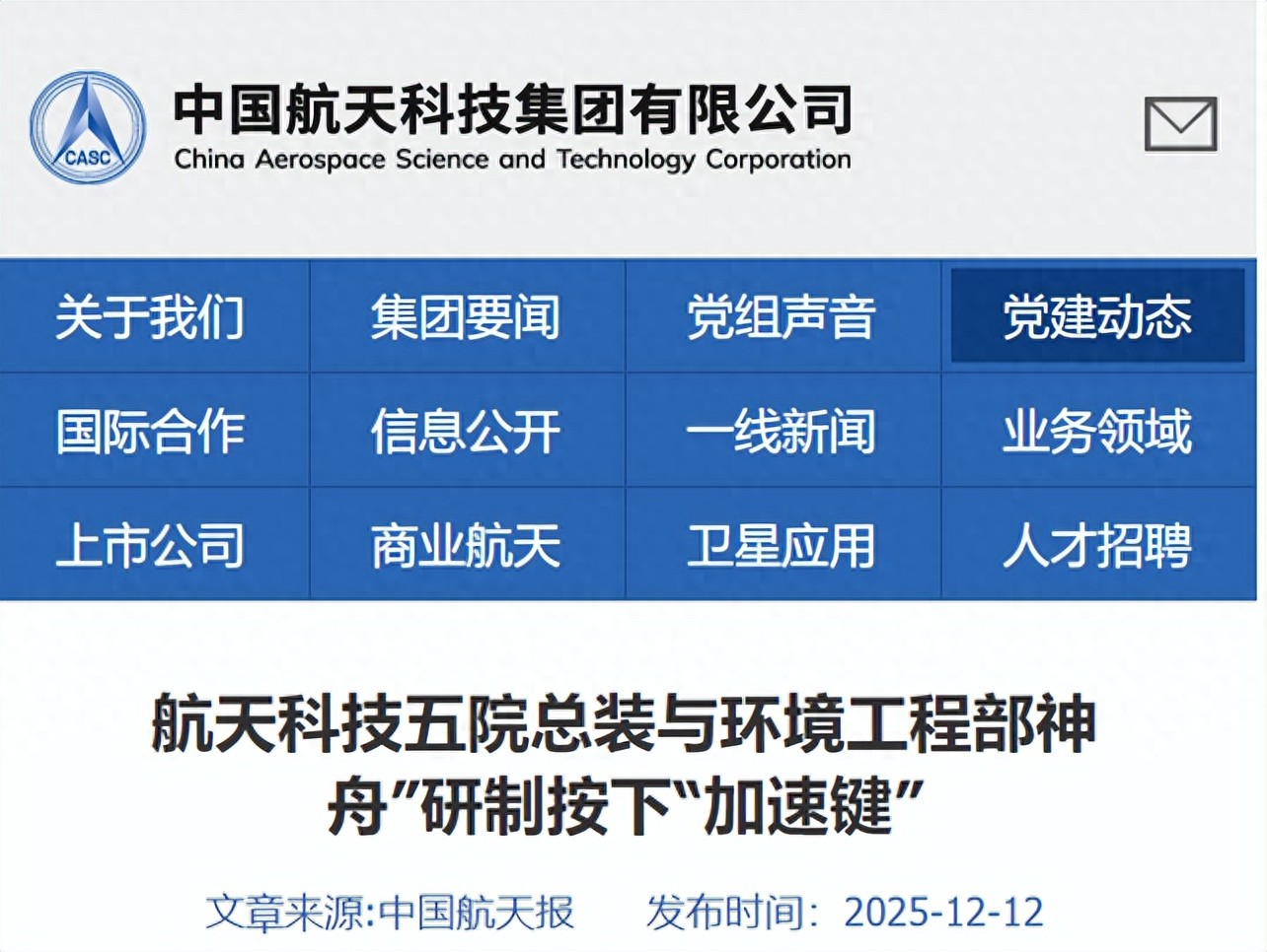 中国航天报12月中旬发布新消息——航天科技五院总装与环境工程部神舟”研制按下“加速键”。