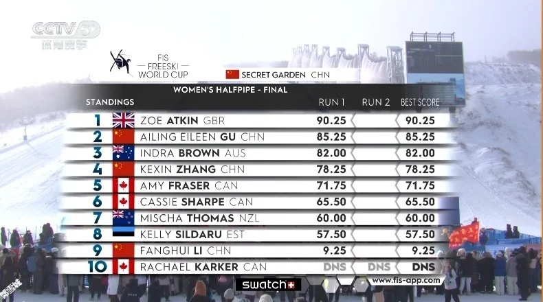 北京时间12月13日,国际雪联U型场地世界杯云顶站自由式滑雪女子决赛,中国队谷爱凌凭借第二跳的出色发挥逆转夺冠,本赛季首夺世界杯分站赛冠军。 两天前进行的预赛,中国队的三名选手谷爱凌、李方慧、张可欣都顺利晋级决赛。而今天的决赛,一共有10位女选手参加。 第一跳,中国选手张可欣得到78.25分,排名第四;李方慧出现失误,而最后出场的谷爱凌第一跳获得85.25分,暂时排名第二。
