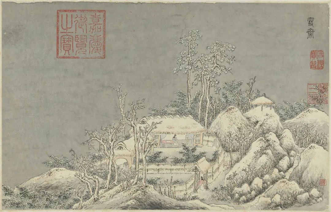 公元一六二五年,沈士充受王时敏之邀为其祖居东园作《郊园十二景图》。图中的十二景依次为:雪斋、秸阁、霞外、就花亭、浣香榭、藻野堂、晴绮楼、竹屋、扫花庵、凉心堂、聚景阁和田舍。
