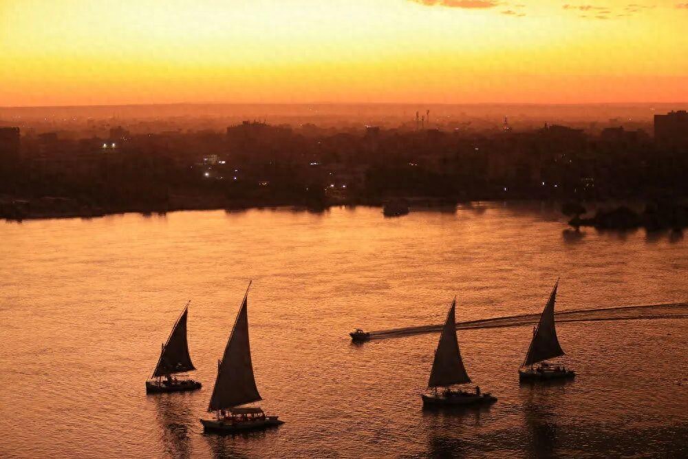 这是2024年11月18日在埃及开罗拍摄的日落时分行驶在尼罗河上的帆船。新华社记者隋先凯摄