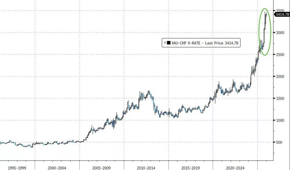 然而,即便是世界上最强的货币,其购买力也在黄金层面出现退化。以瑞郎计价的黄金价格图表显示,过去20年间,这种"最硬"的法定货币已损失超过80%的购买力。