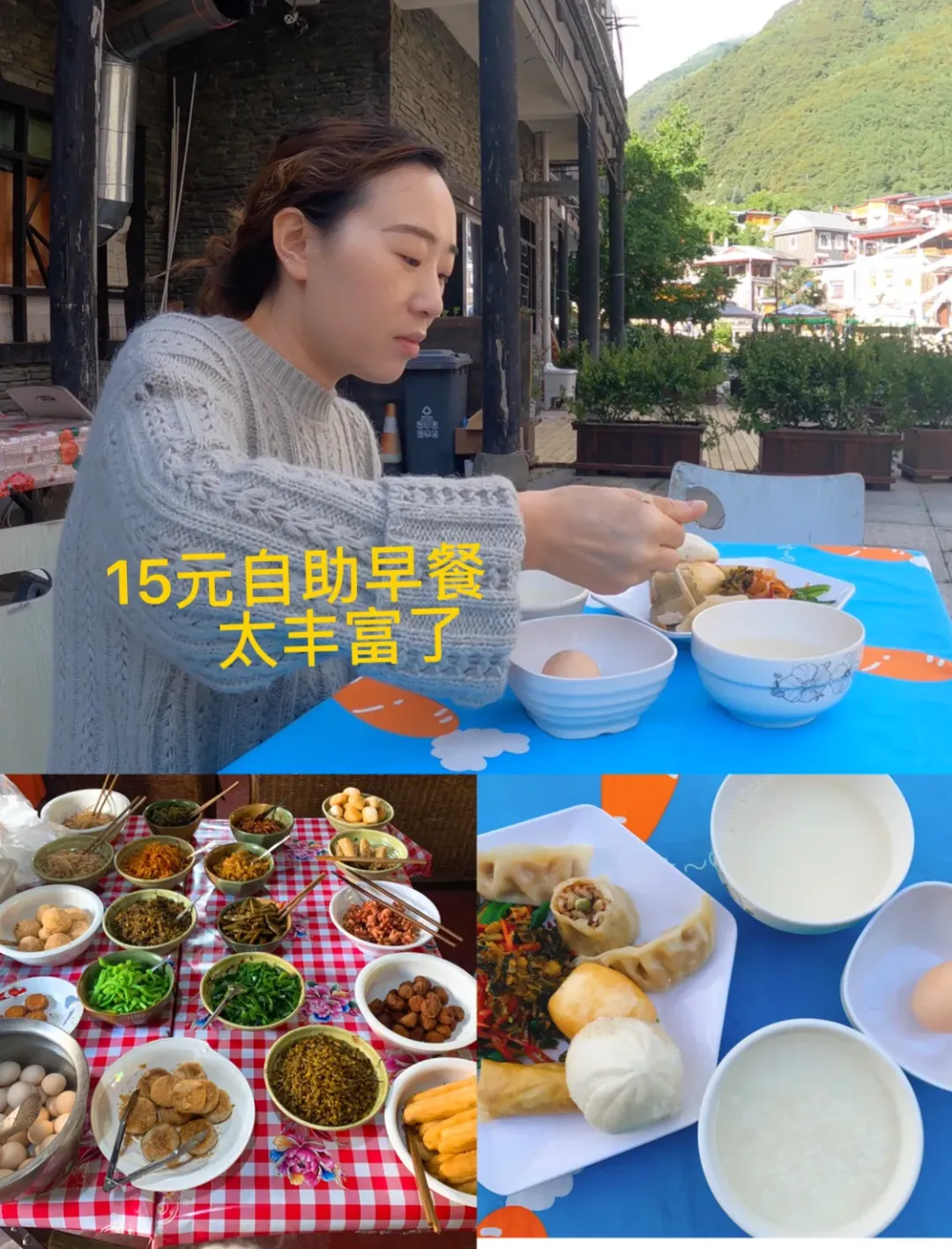今天在卓克基旅游景区这边,晚上继续住这里。早上7点多起来,青旅早餐15元一位,随便吃,不住这里也可以来吃。粥、馒头、包子、花卷、豆浆、油条、麻圆、烧卖、蒸饺,各种榨菜……种类太多了。都是老板自己做的,感觉可以开早餐店了,超级划算!