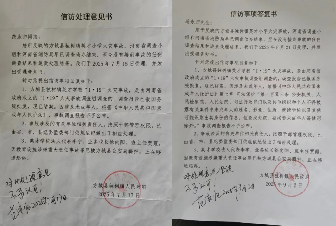 2025年7月17日,他收到独树镇的信访答复:英才学校1·19火灾事故调查报告已结案。因涉及未成年人,根据未成年人保护法,事故调查报告不予公布。
