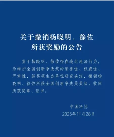 近日,中国科协发布《关于撤销杨晓明、徐佐所获奖励的公告》。 公告显示,鉴于杨晓明、徐佐存在违纪违法行为,为维护全国创新争先奖的荣誉性、权威性、严肃性,经奖项主办单位研究决定,撤销杨晓明、徐佐所获全国创新争先奖奖状,收回所获奖章、证书。 全国创新争先奖是仅次于国家最高科技奖的一个科技人才大奖,是国家科技奖项与国家重大人才计划的有效衔接,于2017年由中国科协联合人力资源社会保障部、科技部、国务院国资...