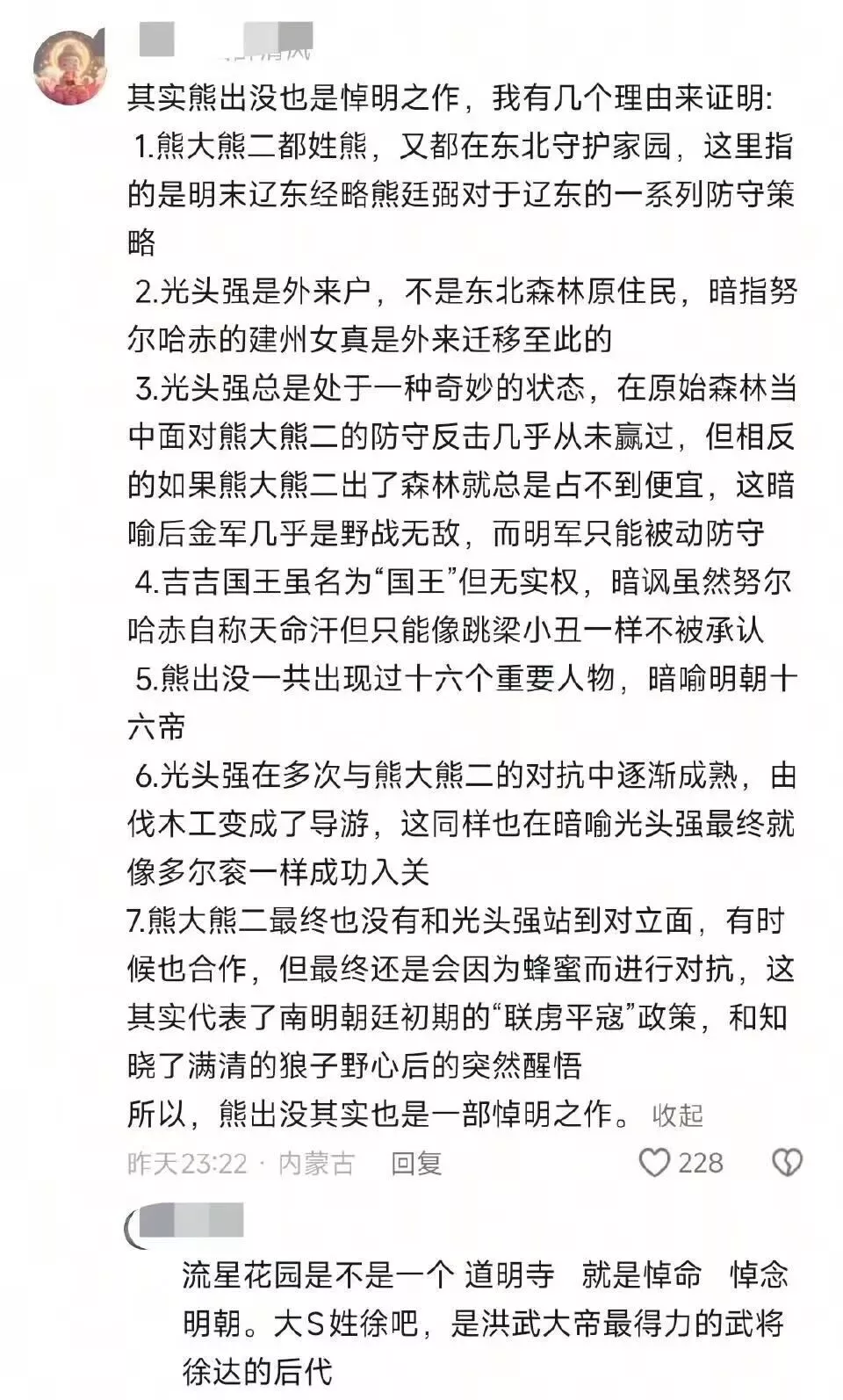 清朝也好明朝也罢,你家祖上事实是挑粪都轮不上木白文笔平平12/13/2025因红楼梦发起的悼明运动在网络探讨热烈。翻看了一下,现在已经不仅仅是红楼梦了,就连《流星花园》,《三体》,甚至是《熊出没》啥的都是在致敬明朝。 看看上面这些半戏谑半认真的评论,不知道朋友们作何感想? 00