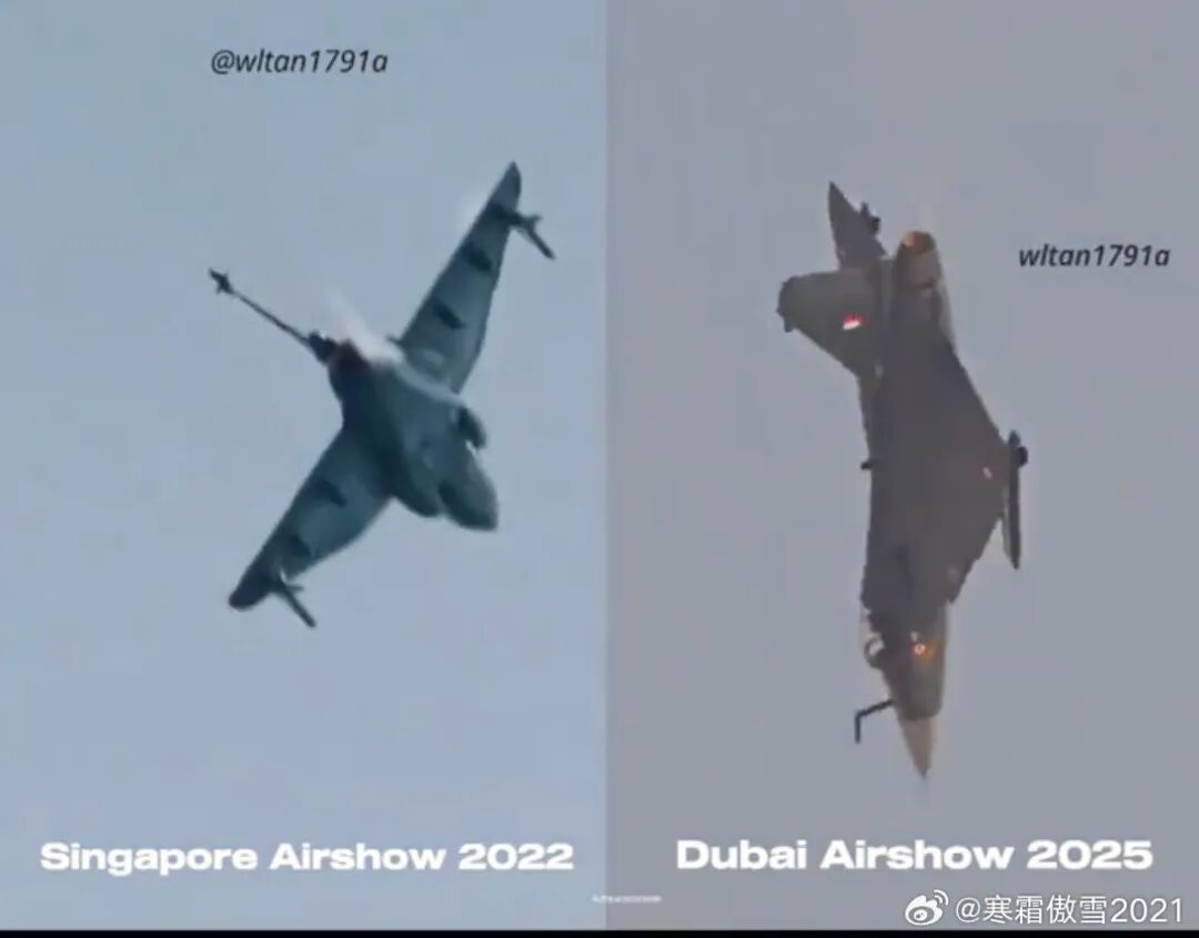 LCA迪拜航展2025坠毁原因初步分析(以空难调查结论为准) ➡️图1(图源wltan1971a)左边是2022新加坡航展表演的LCA: 图2(图源银杏叶文创工作室)是这次迪拜航展坠毁的LCA均出现右侧油液雾状喷射,应该不是发动机故障、如果是发动机故障,新加坡航展表演的LCA应该同样坠毁。初步推断是LCA的油箱压力过大排出部分燃油减少环控系统压力。