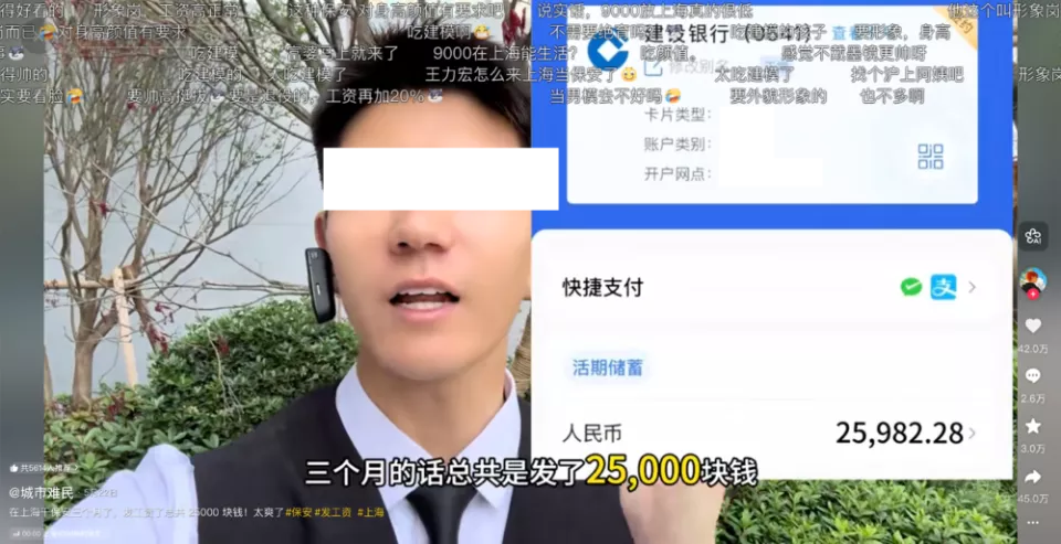 一名在售楼处做保安的博主就声称,自己一个月可以在上海挣9000块。
