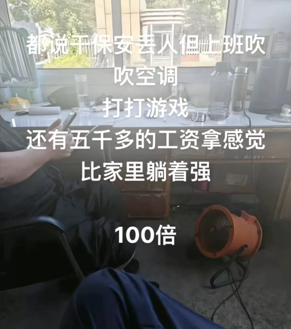在保安的行业内有两个黑话:酱油岗和战神岗。其中,酱油岗指的是坐在有空调的室内,事少清闲,每天打打游戏、吃吃饭就过去了。我们日常能看到的悠闲人士,多是这个岗位。