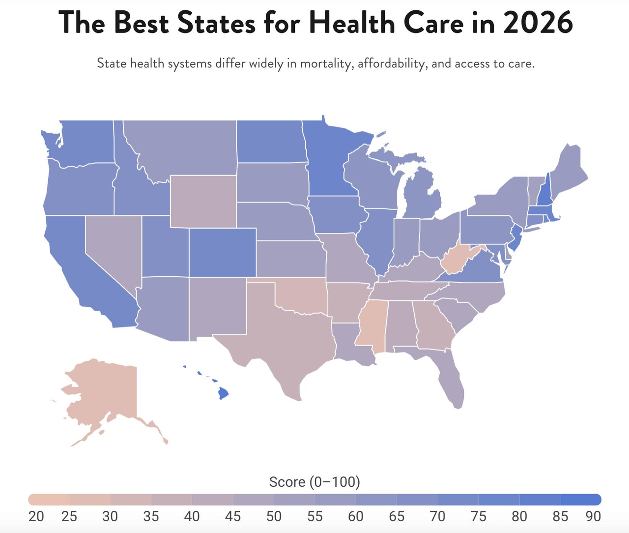 紧随其后的是麻州(Massachusetts),平均79.6岁。该州拥有全美最高的保险覆蓋率,97.4%的居民有保险。位于另一端的则多为美国东南部州,其中居民寿命最短的是密西西比州,平均寿命仅70.9岁,这很可能与该州全美最高的死亡率有关。这份报告显示,居住州别会左右寿命与生活品质;在美国,最长寿的夏威夷与最短寿的密西西比之间差距高达九年。