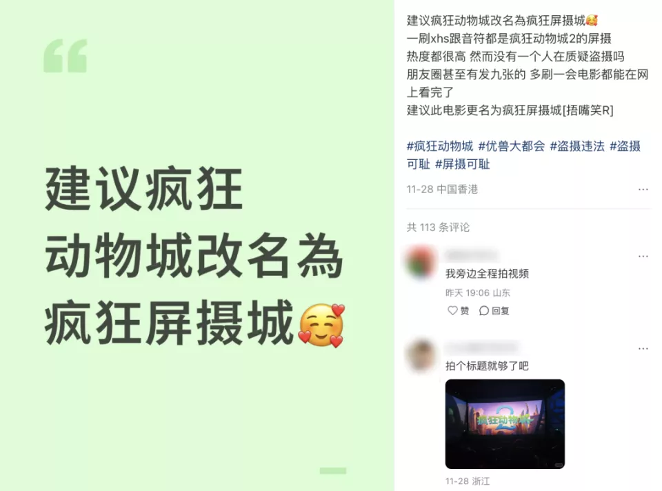 随着电影剧情的发展,朱迪和尼克在银幕里上演深情告白,越来越多的观众举起手机,对准银屏,迫不及待地将关键剧情定格、录制,分享到社交平台。