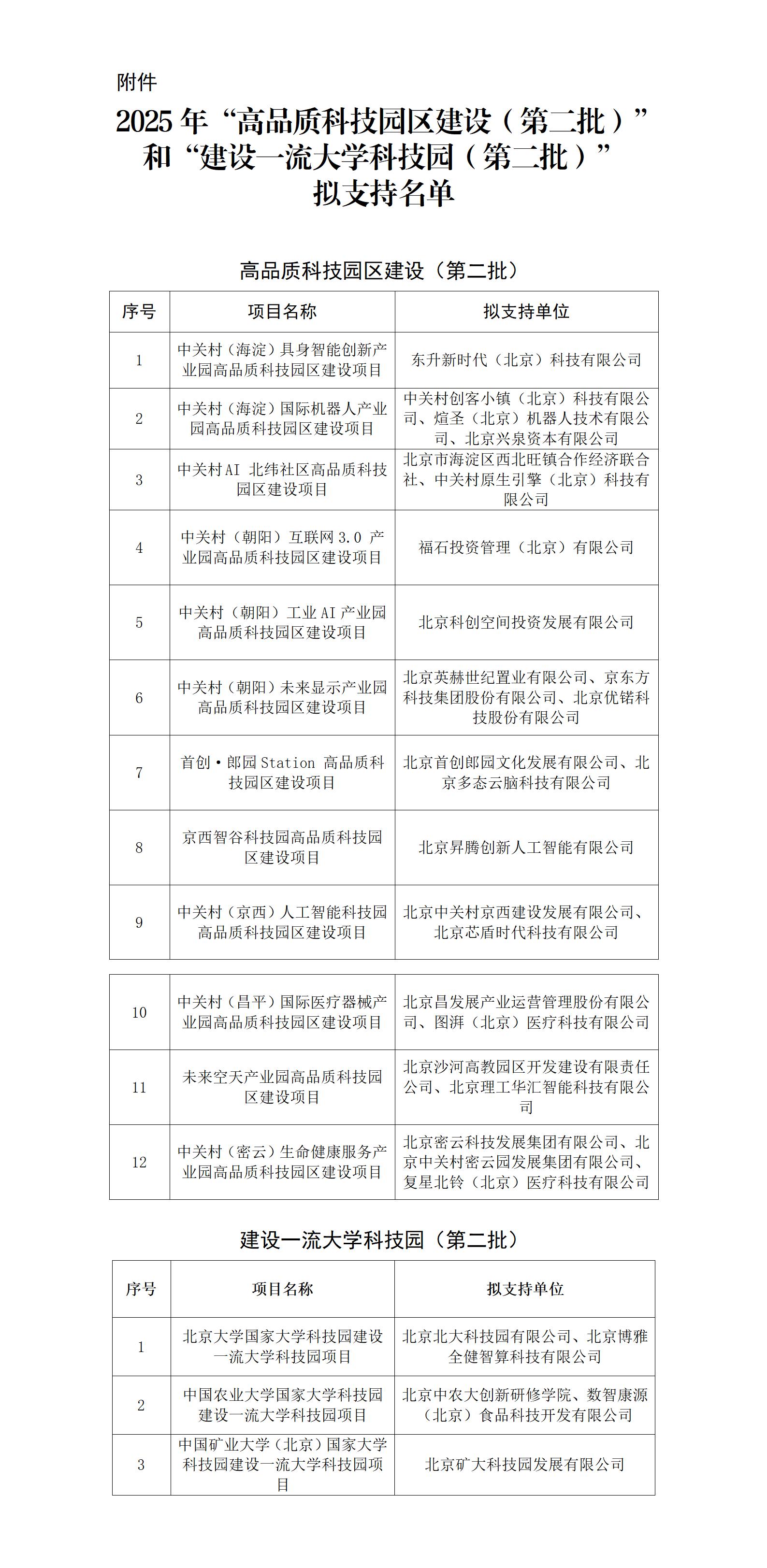 北京市科学技术委员会、中关村科技园区管理委员会关于公示2025年“高品质科技园区建设(第二批)”和“建设一流大学科技园(第二批)”拟支持项目的通知