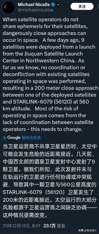 先说说事情的经过,美国当地时间 12 月 13 日,SpaceX 的星链工程副总裁迈克尔・尼科尔斯公开表示,中国中科宇航用 “力箭一号” 火箭发射的 “一箭九星”,在入轨 48 小时后,有一颗卫星和他们的星链 - 6079 卫星发生了近距离接触。