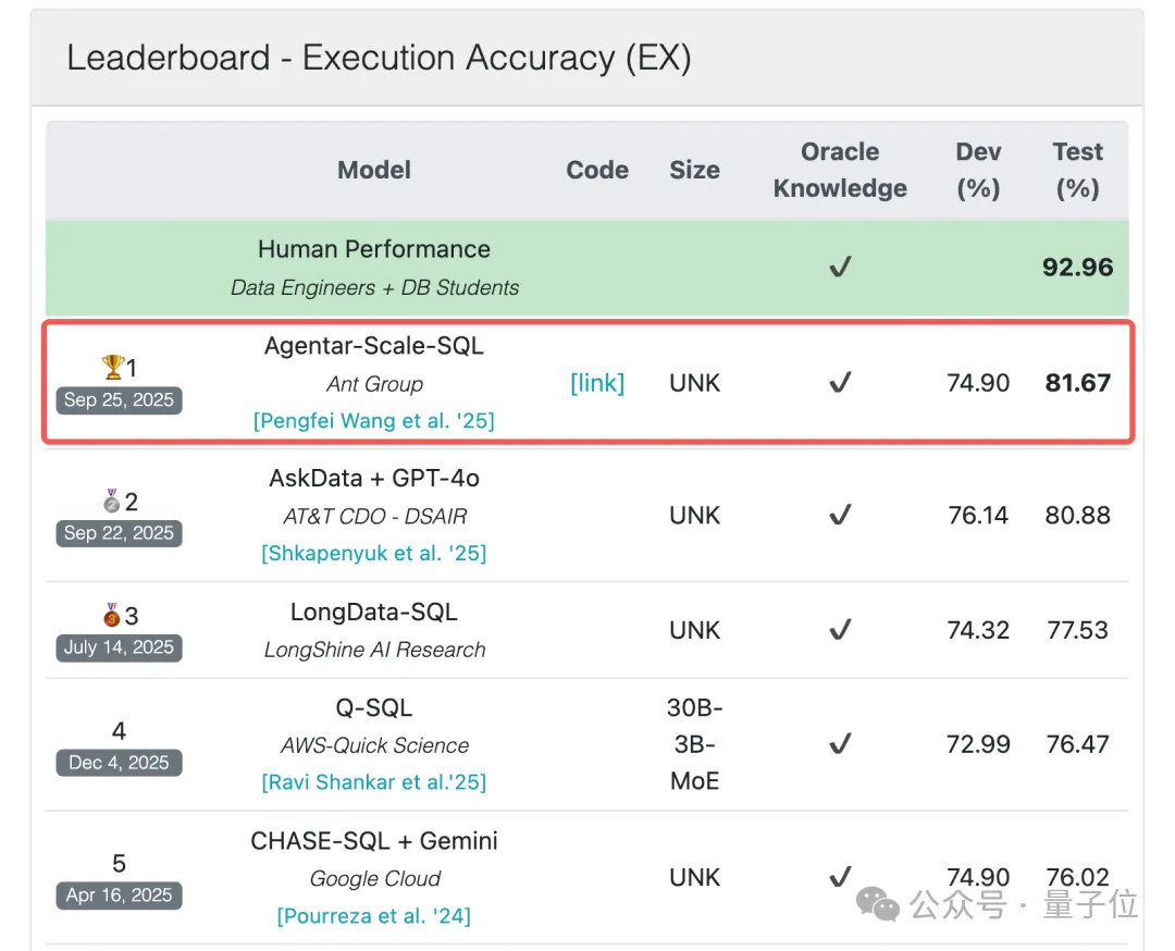 就在今年9月,蚂蚁数科的Agentar-Scale-SQL在BIRD榜单上以执行准确率(81.67%)和执行效率(77%),双料第一的成绩登顶一举超越了谷歌、亚马逊等国际科技巨头。