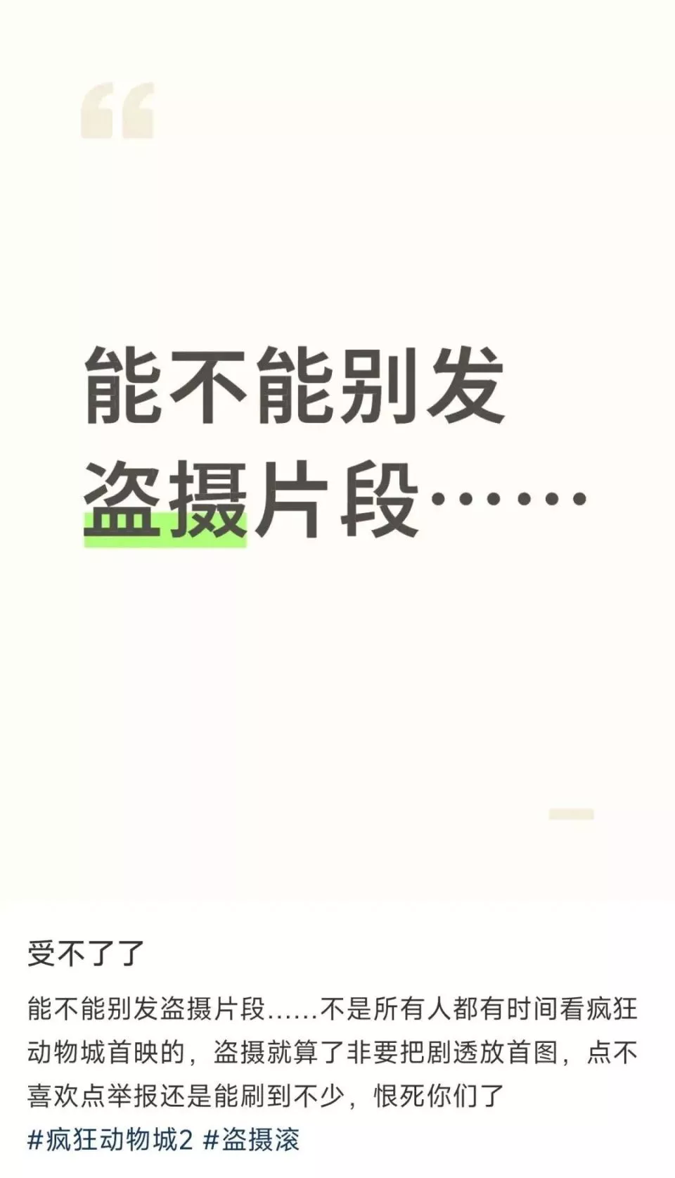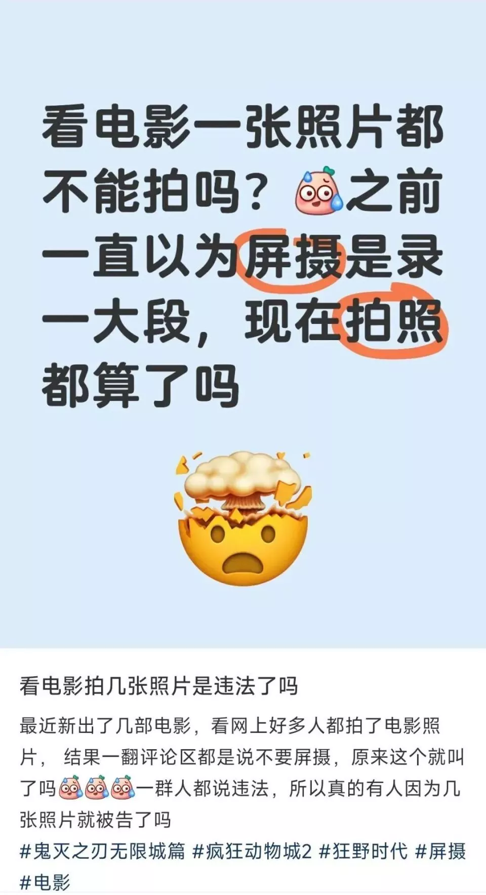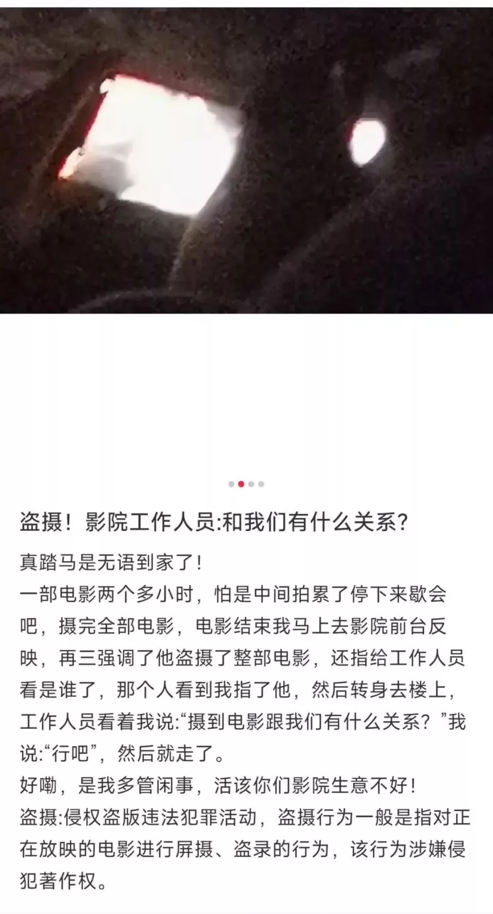 也就是说,我们在网上分享的任何一张拍摄正在放映的银幕的照片,包括片名、彩蛋,都算“屏摄盗摄”。