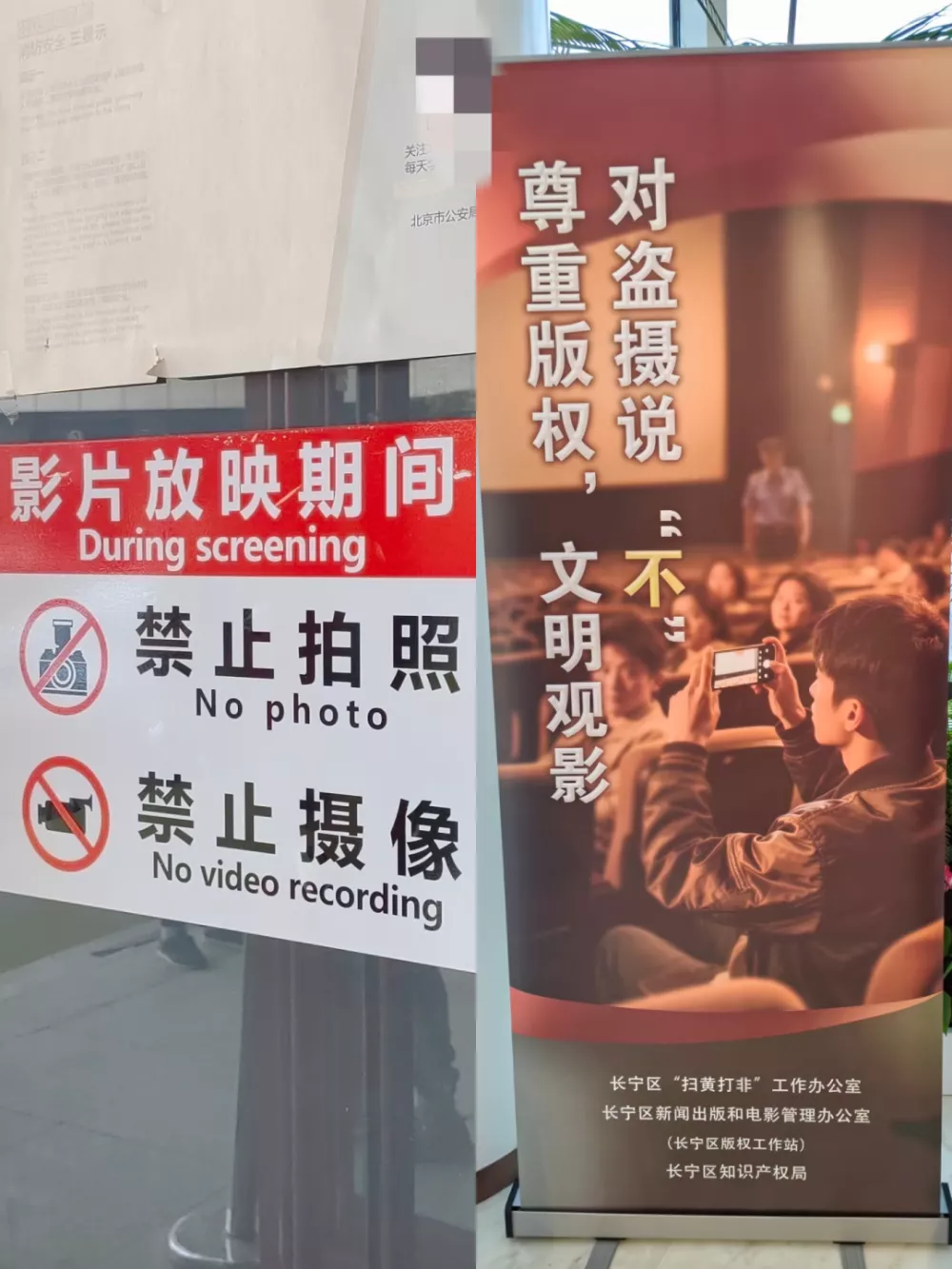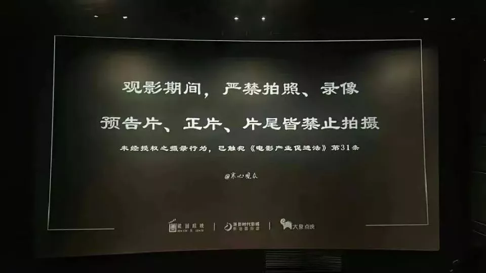 一些影院会在电影开始前的片头广告里,加上一句醒目的提醒:“请关闭手机拍摄,尊重版权。”
