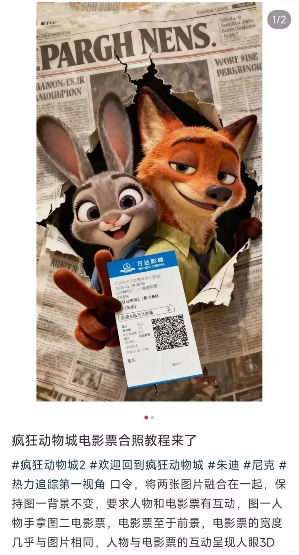 刚刚上映的《疯狂动物城》,不少人用AI生成自己和尼克、朱迪在电影院里的合照,栩栩如生。还有人分享各种花样打卡方式。